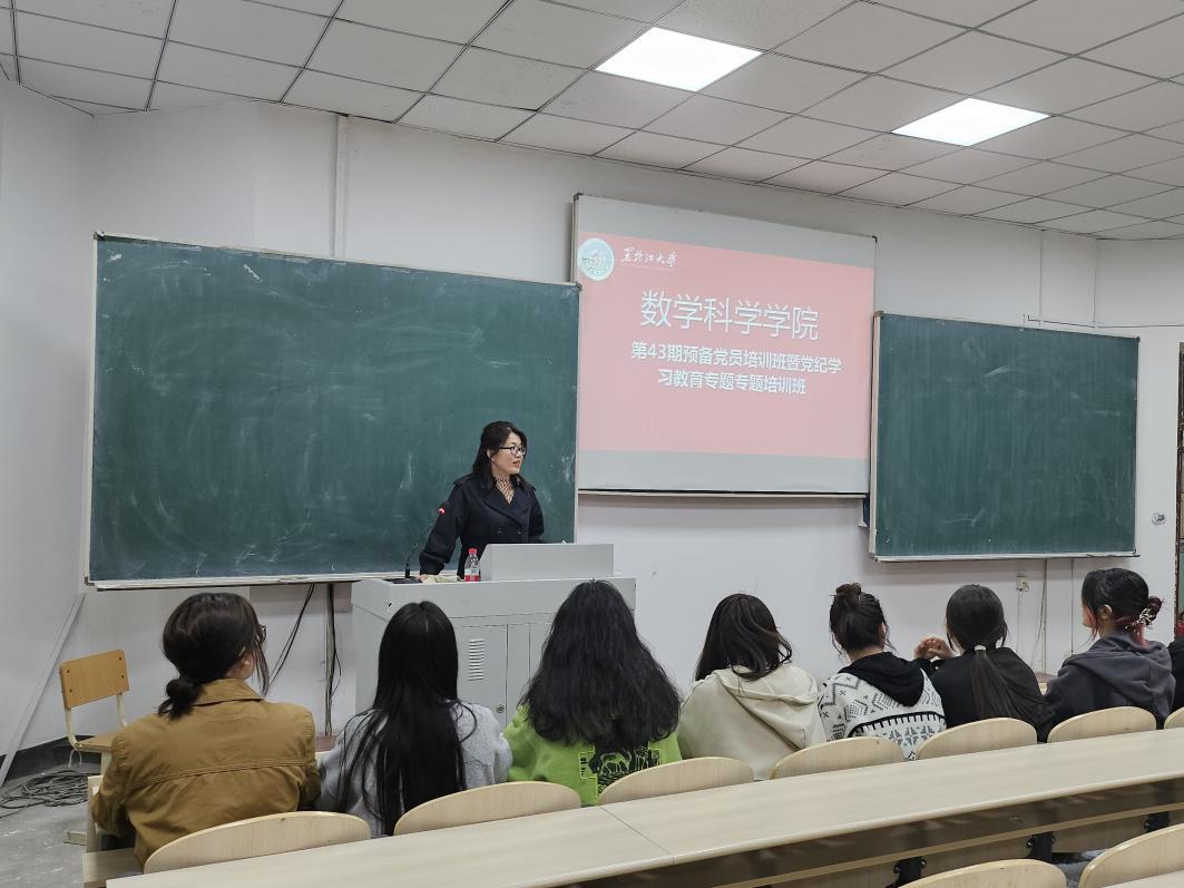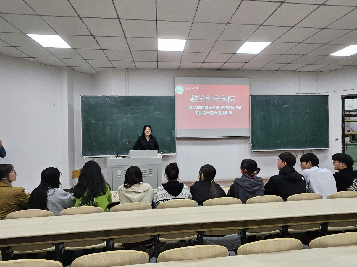 为进一步加强对预备党员的教育和培养,提高学生思想水平和政治素养,引导学生党员进一步发挥先锋模范作用,激发爱党、爱国、爱校情怀,按照学生工作部《关于举办第43期学生预备党员培训班暨党纪学习教育专题培训班的通知》要求,数学科学学院于4月26日18时在一号楼101开展第43期预备党员培训暨学习《中国共产党纪律处分条例》专题辅导。本次党课由数学科学学院党委副书记徐静波主讲,培训班全体学员参加。