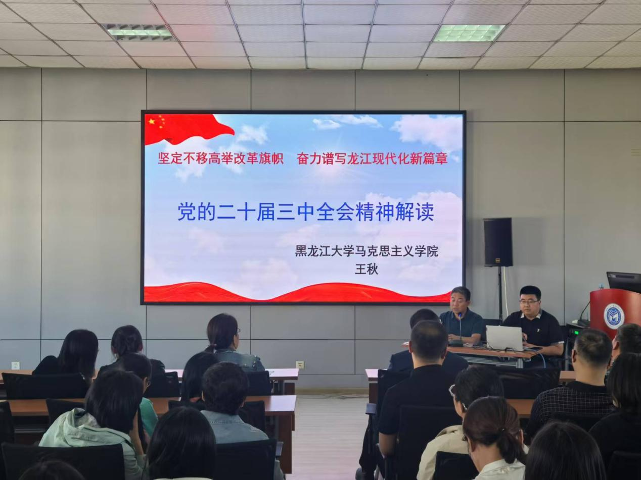 为深刻领会党的二十届三中全会精神和省委十三届六次全会精神,按照学校《中共黑龙江大学委员会关于学习宣传贯彻党的二十届三中全会精神的通知》和《中共黑龙江大学委员会关于做好省委十三届六次全会精神学习宣传贯彻的通知》相关要求,9月18日下午,数学科学学院开展学习贯彻党的二十届三中全会精神宣讲会。学校专家宣讲团成员、马克思主义学院院长王秋教授以《坚定不移高举改革开放旗帜 奋力谱写龙江现代化新篇章》为题做主题宣讲,全院教工党员、民主党派、无党派知识分子,及学生党员代表共计100余人参加本次宣讲,学院党委书记张龙主持会议。