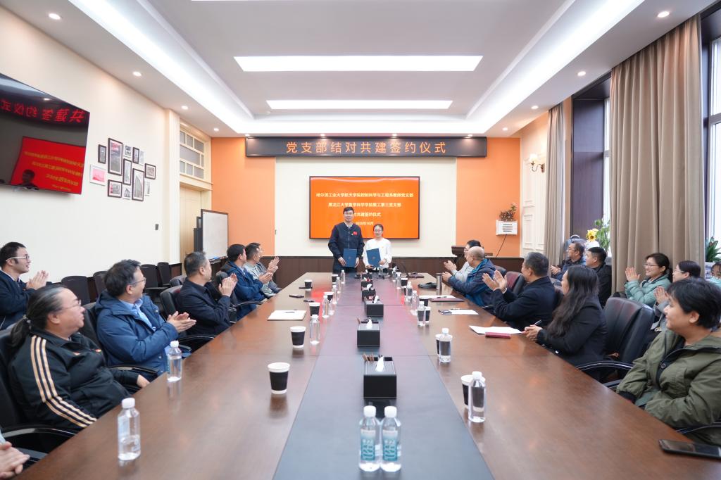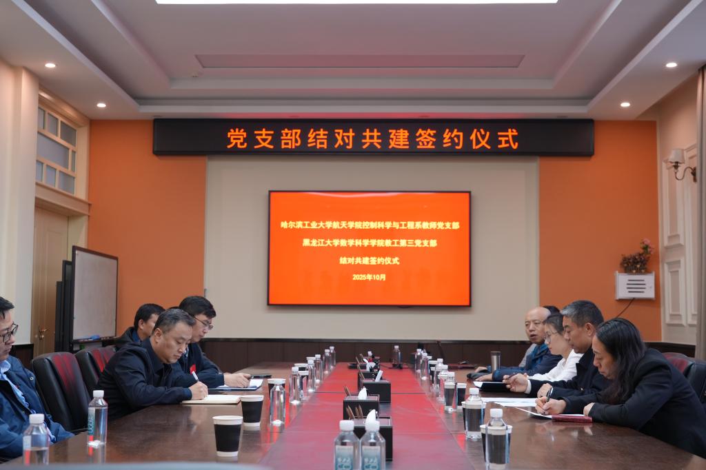 为深入贯彻落实习近平新时代中国特色社会主义思想,全面推进一融双高建设,不断探索创新党建工作模式,全面构建共建共享、双向促进、共同提高的基层党建新格局,10月29日下午,黑龙江大学数学科学学院教工第三党支部与哈尔滨工业大学航天学院控制科学与工程系教师党支部共同举办党建结对共建签约仪式暨“筑牢数理基石、赋能空天报国”主题党日活动。会议由哈尔滨工业大学航天学院副院长、控制科学与工程系教师党支部书记孙光辉主持。哈尔滨工业大学航天学院党委书记马峰、黑龙江大学数学科学学院党委书记张龙、教工第三党支部书记于婷婷及参与共建的各党支部全体党员出席会议。