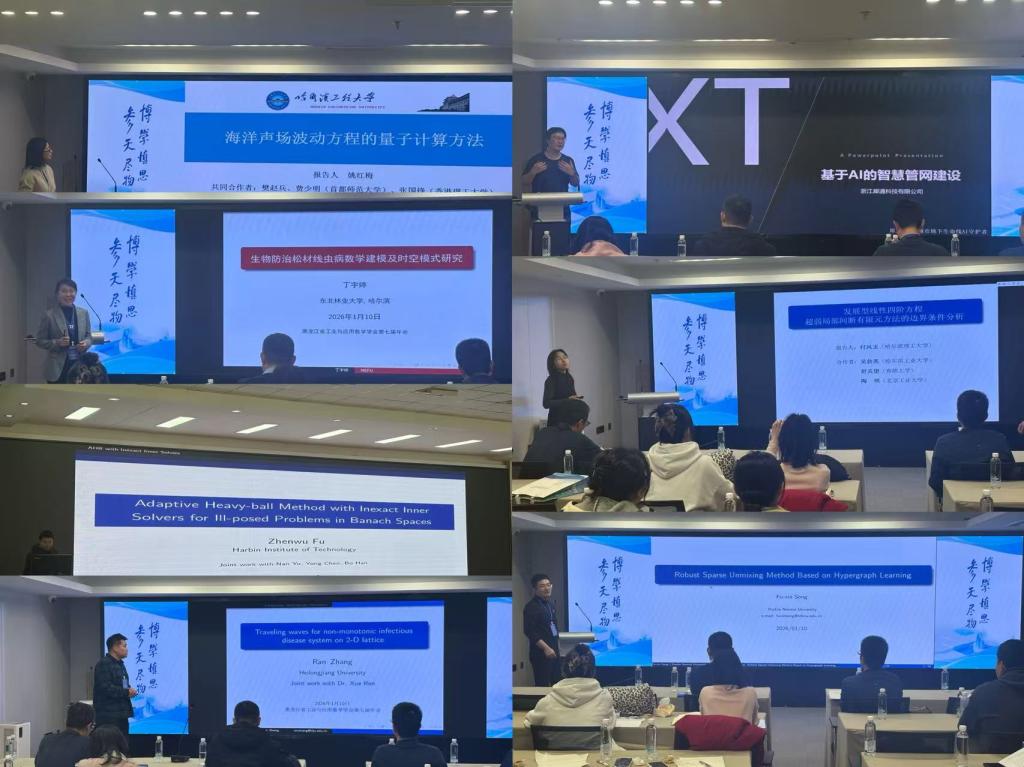 大会期间还设置了学术报告交流环节,多位来自高校和企业的专家学者围绕工业与应用数学的前沿理论、计算方法及实际应用作了精彩报告。报告内容涵盖人工智能、传染病动力学、量子计算、数值方法、图学习及生物数学等多个研究方向,充分展示了应用数学在解决复杂实际问题中的独特优势。报告包括:“基于 AI 的智慧管网建设”(孙忆业,浙江犀通科技有限公司)、“二维离散扩散下非单调传染病系统的行波解”(张冉,黑龙江大学)、“海洋声场波动方程的量子计算方法”、“Analysis of the boundary conditions for the ultralweak-local discontinuous Galerkin method of time-dependent linear fourth-order problems”(付风玉,哈尔滨理工大学)、“Robust Sparse Unmixing Method Based on Hypergraph Learning”(宋福新,哈尔滨师范大学)、“生物防治松材线虫病数学建模及时空模式研究”(丁宇婷,东北林业大学)以及 “Adaptive heavy-ball method with inexact inner solvers for ill-posed problems in Banach spaces”(付振武,哈尔滨工业大学)。报告内容深入、讨论热烈,现场学术氛围浓厚。