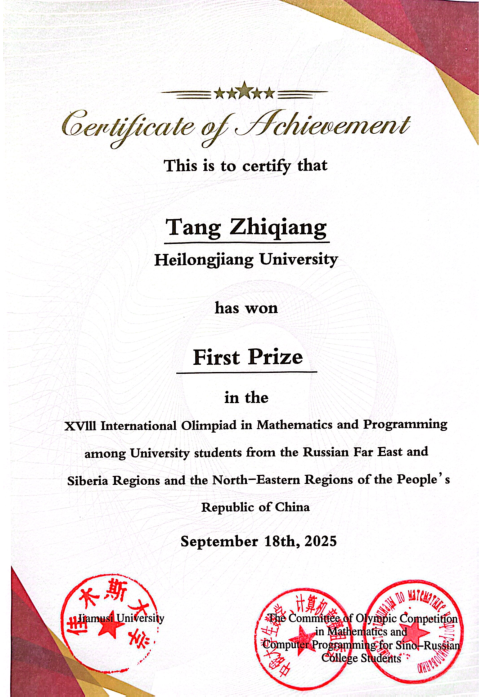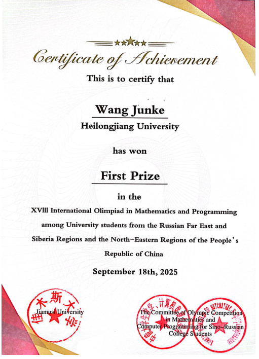 第十八届中国黑龙江与俄罗斯远东地区大学生数学、计算机竞赛于2025年9月18日在佳木斯大学举行,由黑龙江省和俄罗斯远东地区两个国家的10余所高校的学生参加比赛。经过学校数学竞赛组委会的精心筛选,今年我校参加数学竞赛的有王筠可、唐志强和郝璐凯3名学生,由王士模老师带队参加比赛。这次竞赛中参赛学生经过努力取得了优异的成绩,3名参赛学生全部获奖。在这里向在这次竞赛中获奖的学生表示祝贺。现公布本次数学竞赛获奖名单如下: