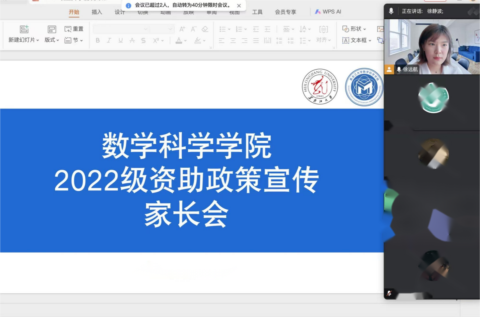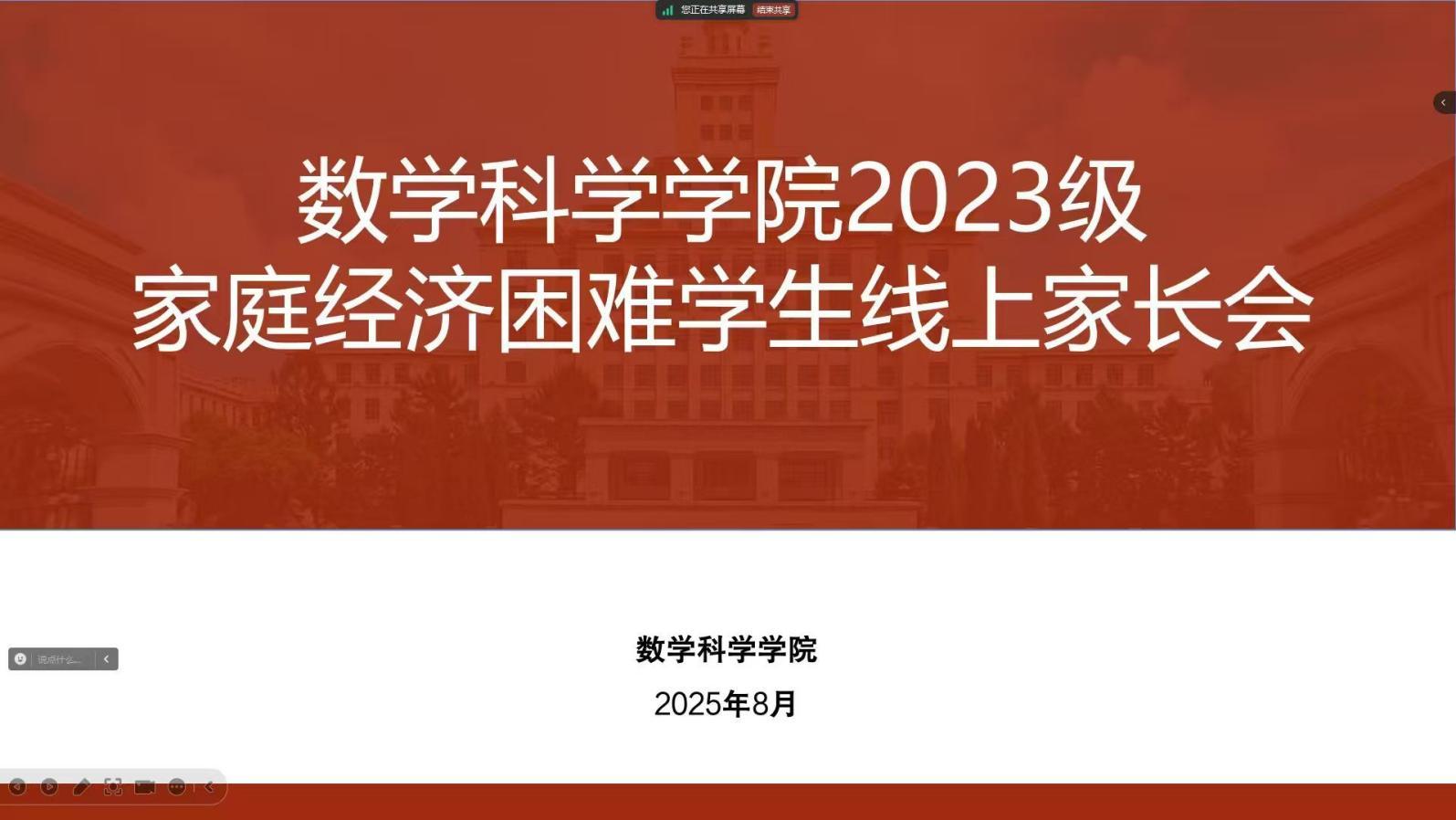 此次线上家长会不仅实现了资助政策的“精准传递”,更推动了家校协同育人的 “深度融合”。家长全面掌握了 2025 年资助政策的新变化、新举措,进一步明确了家校协同的发力点;学院也通过线上互动收集了家长对资助工作的意见建议,为后续优化帮扶方案提供了参考。未来,数学科学学院将持续紧跟国家资助育人政策导向,以更精准、更温暖的举措,护航每一位家庭经济困难学生。(数学科学学院供稿)