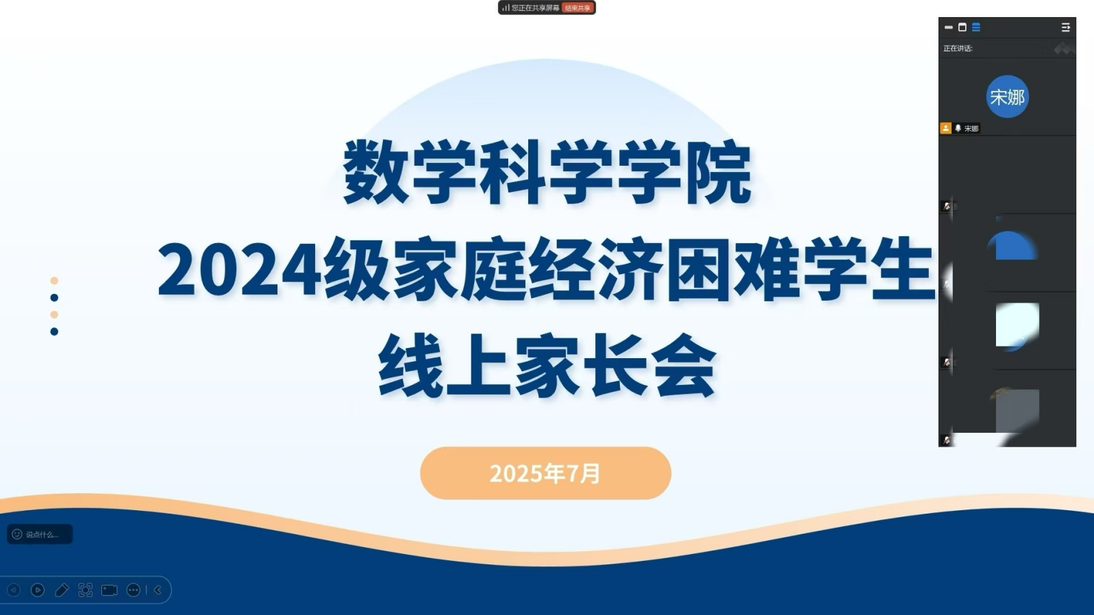 为深入宣传国家及学校最新资助育人政策,进一步深化资助育人成效,精准对接家庭经济困难学生成长需求,2025年暑期,数学科学学院聚焦家庭经济困难学生群体,分年级有序召开家庭经济困难学生线上家长会。会议依托云端平台打破空间壁垒,以政策解读、情感关怀与精准帮扶为核心,扎实推进家庭经济困难学生成长帮扶工作,成功搭建起家校协同育人的“暖心桥梁”。