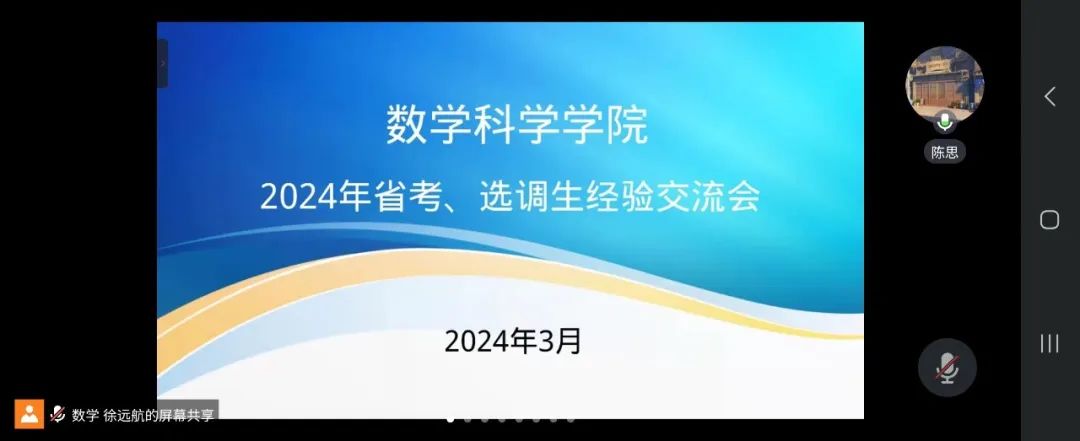 为进一步做好2024届毕业生公务员招录指导工作,帮助2024届毕业生搭建相互学习、交流的平台,助力学生高效冲刺2024年省考。2024年3月14日,数学科学学院开展2024年选调生、公务员备考经验交流会。会议邀请2023届优秀毕业生陈思、周景楠做经验分享,由2020级、2022级辅导员徐远航老师主持,意愿考公的2024届毕业生和在校生参会。