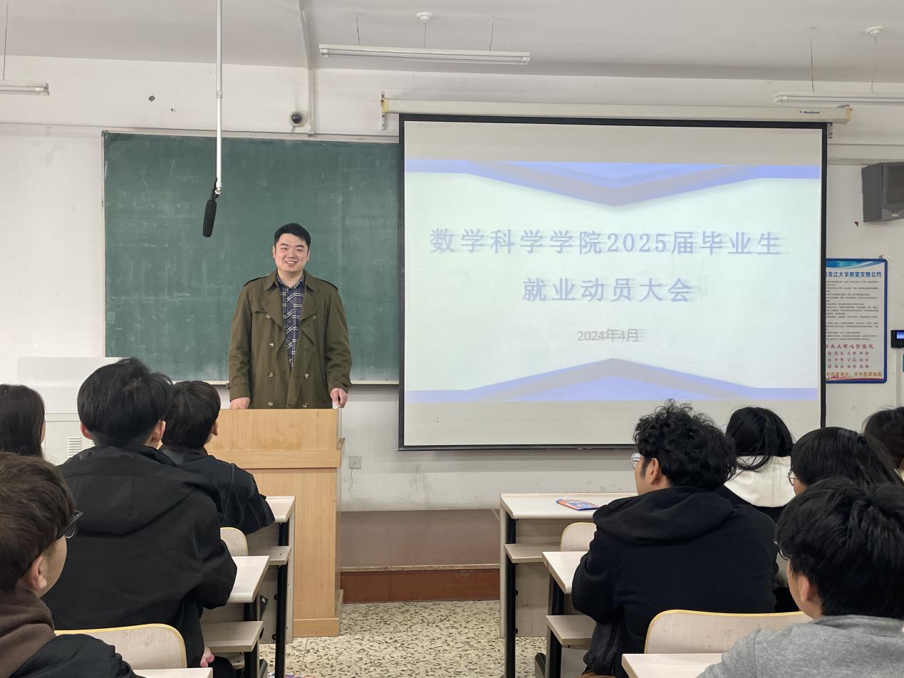 为切实做好2025届毕业生就业指导服务工作,帮助学生明确自己的生涯规划和学业目标,建立正确的择业就业观念。数学科学学院于2024年4月10日召开2025届毕业生就业工作动员大会。本次大会由2021级辅导员张卓豪主持,学院全体2025届毕业生参加。